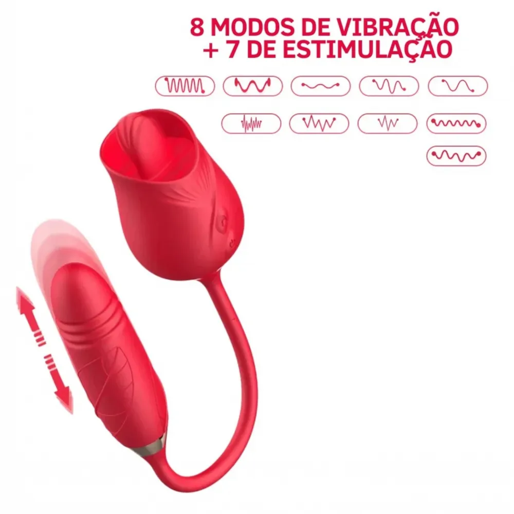 Estimulador clitoriano com duas pontas estimuladoras, sendo uma ponta com estimulador clitoriano em formato de flor por língua mágica com movimentos e outra ponta com vibrador estimulador ponto G com vai e vem.